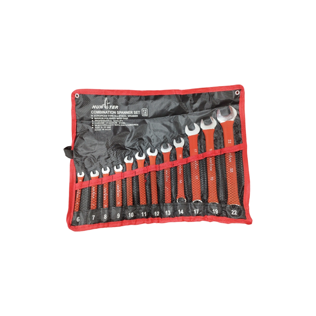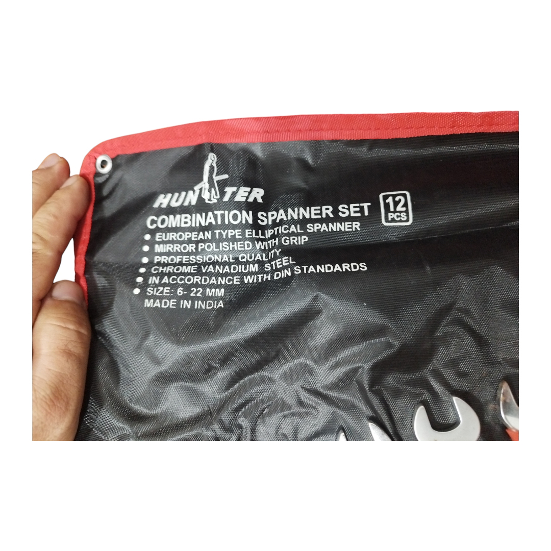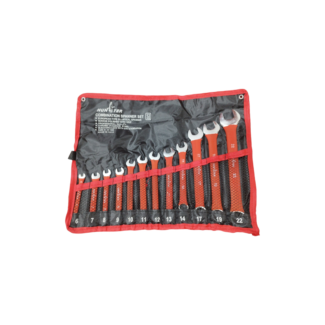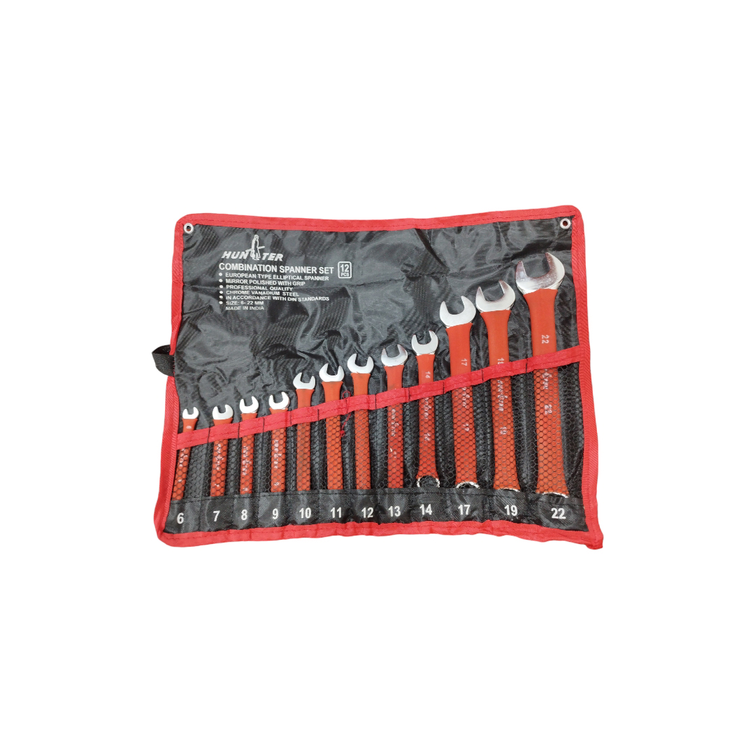 مجموعه آچار یکسر تخت یکسر رینگ هانتر ساخت کشور هند می باشد و از کیفیت بی نظیری برخوردار است. این مجموعه حاوی 12 عدد آچار یک سر رینگی و یک سر تخت در سایزهای 6 تا 22 است. برای ساخت آچارهای این محصول از بهترین آلیاژ کروم وانادیوم استفاده شده است تا مقاومت بالایی در برابر ضربه و فشار داشته باشد. این مجموعه آچار درون یک کیف برزنتی قرار گرفته است.