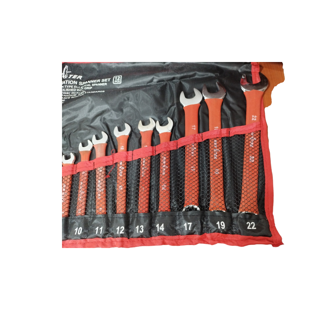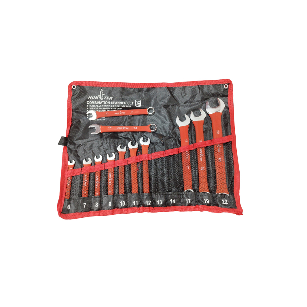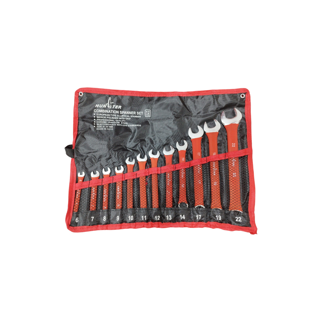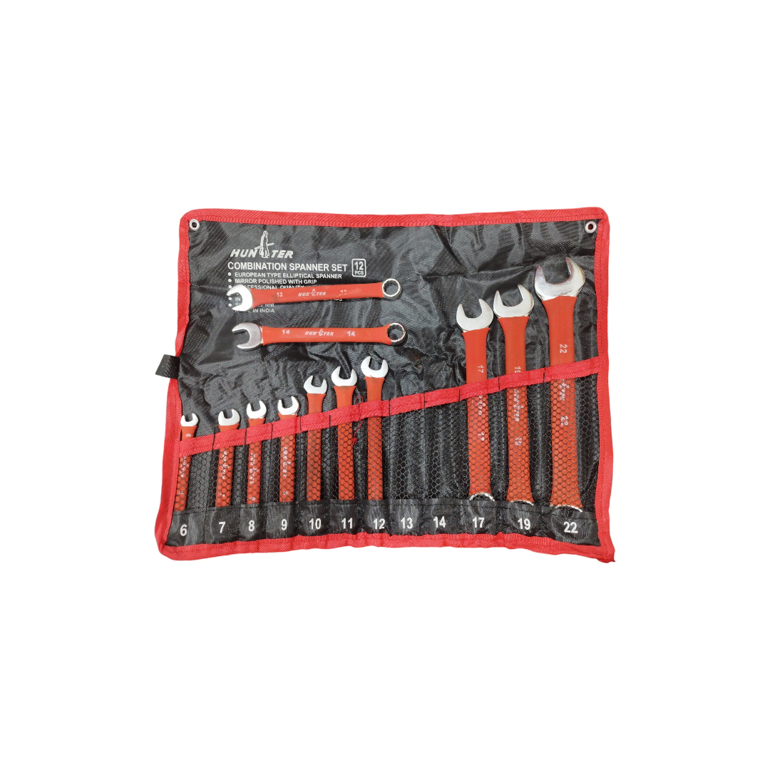 مجموعه آچار یکسر تخت یکسر رینگ هانتر ساخت کشور هند می باشد و از کیفیت بی نظیری برخوردار است. این مجموعه حاوی 12 عدد آچار یک سر رینگی و یک سر تخت در سایزهای 6 تا 22 است. برای ساخت آچارهای این محصول از بهترین آلیاژ کروم وانادیوم استفاده شده است تا مقاومت بالایی در برابر ضربه و فشار داشته باشد. این مجموعه آچار درون یک کیف برزنتی قرار گرفته است.